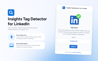 Insights Tag Detector for LinkedIn, Chrome tarayıcısı için geliştirilmiş ücretsiz bir eklentidir. Bu araç, ziyaret ettiğiniz herhangi bir sayfada LinkedIn izleme etiketlerinin doğru bir şekilde kurulu olup olmadığını hızlıca kontrol etmenizi sağlar. Her sekmeyi otomatik olarak tarar ve araç çubuğu simgesini gerçek zamanlı olarak günceller. Ayrıca, tekil, eksik veya çoğaltılmış LinkedIn Insight Etiketlerini tespit eder ve ortak kimliklerini tek tıklamayla kopyalamanıza olanak tanır.
